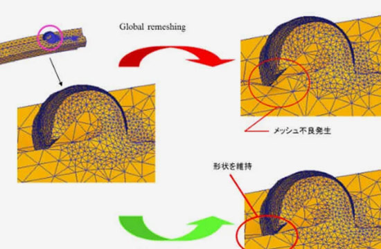 ユーザー直接定義によるメッシュサイズの調整が可能です。必要な部分のみメッシュを再構成するリメッシュ機能も搭載しています。