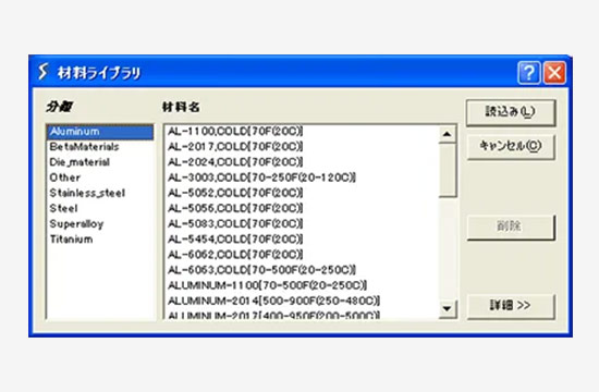 スチール、アルミニウム、ステンレス、銅など、冷間用は約150鋼種、温熱間用は約300鋼種のデータを取り揃えています。