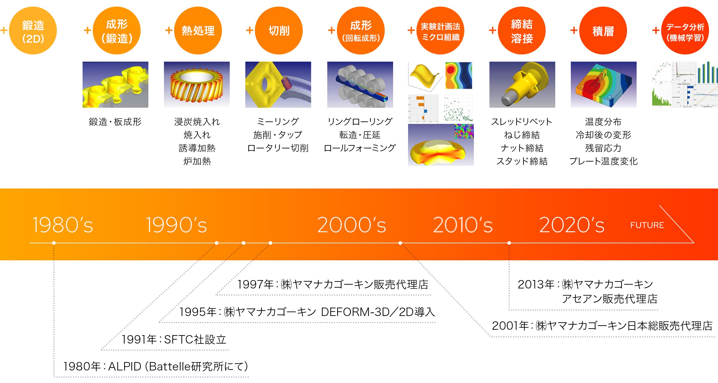CAEソフト「DEFORM」は、もともと航空機用の鍛造部品における試作コストの削減や、リードタイムの短縮を目的として、アメリカで開発が始まりました。誕生当初は熱間鍛造を対象としていましたが、やがてその適用範囲は熱処理、切削といった後工程へと広がり、一貫したプロセス連携を視野に入れた進化を遂げていきます。