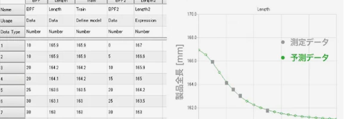 データ分析(機械学習を用いた分析ツール)では、ニューラルネットワークなどの機械学習法を用いて、過去の実測データや解析結果を機械学習し、シミュレーションせずに、新たな条件の結果を予測することができます。寸法や寿命数も予測値として算出できます。