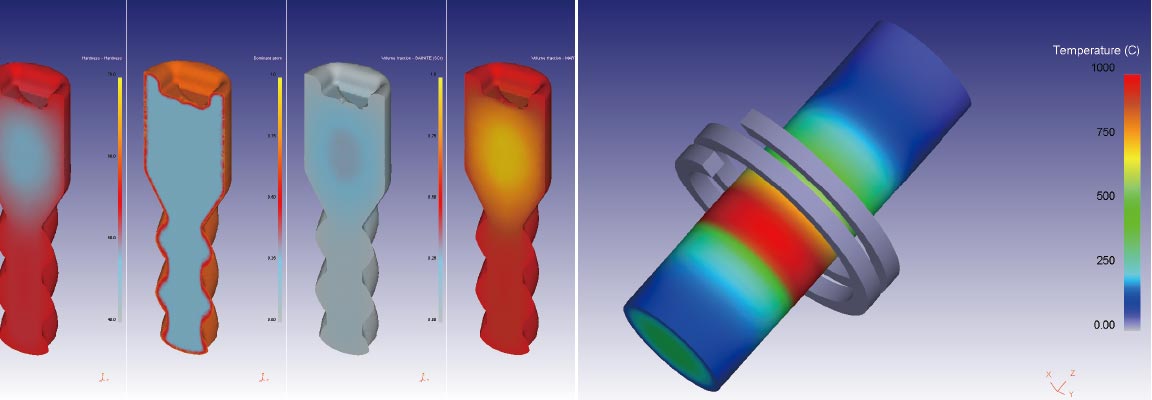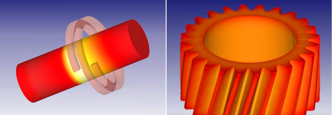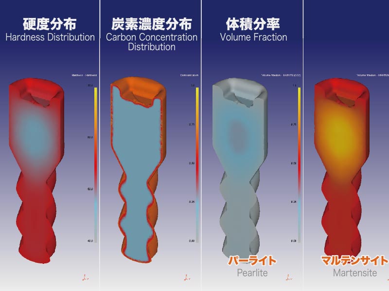 焼入れによる硬度分布、浸炭・拡散による炭素濃度分布、熱処理プロセス中に起こる相変態の体積分率、誘導加熱中の温度変化などを解析結果から得ることができます。