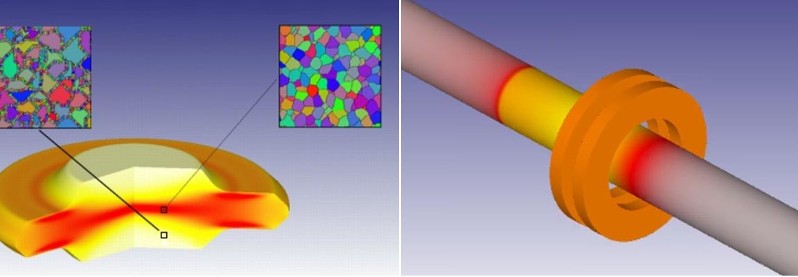DEFORMでは、鍛造や切削などの加工中に発生する素材内部の組織変化を、成形挙動と同時にシミュレーションできます。たとえば、切削時の局所的な加熱による焼き入れ現象や、動的再結晶による強度変化の過程を可視化することも可能です。