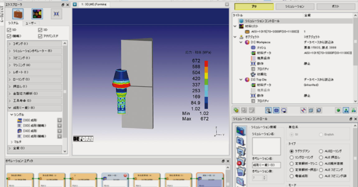 多工程の条件をまとめて設定する「一貫製造プロセス」や、複数の加工ステップを一括管理できる「オペレーションエディター」など、実際の製造プロセスの流れを意識した操作画面設計も、DEFORMの大きな魅力のひとつです。 -