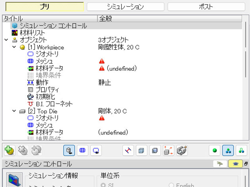 鍛造・切削・熱処理に強みを持つCAEソフト「DEFORM」の大きな特長は、「プリ」「ソルバー」「ポスト」が一体型で統合されている点にあります。一般的なCAEソフトでは、これらが別々のソフトウェアやモジュールに分かれている場合も多く、例えばソルバーで得た解析結果を別ブランドのCAEに変換して読み込む必要が生じます。その際、フォーマット変換や余分な作業が発生するだけでなく、操作体系の違いから、効率が低下するリスクも避けられません。